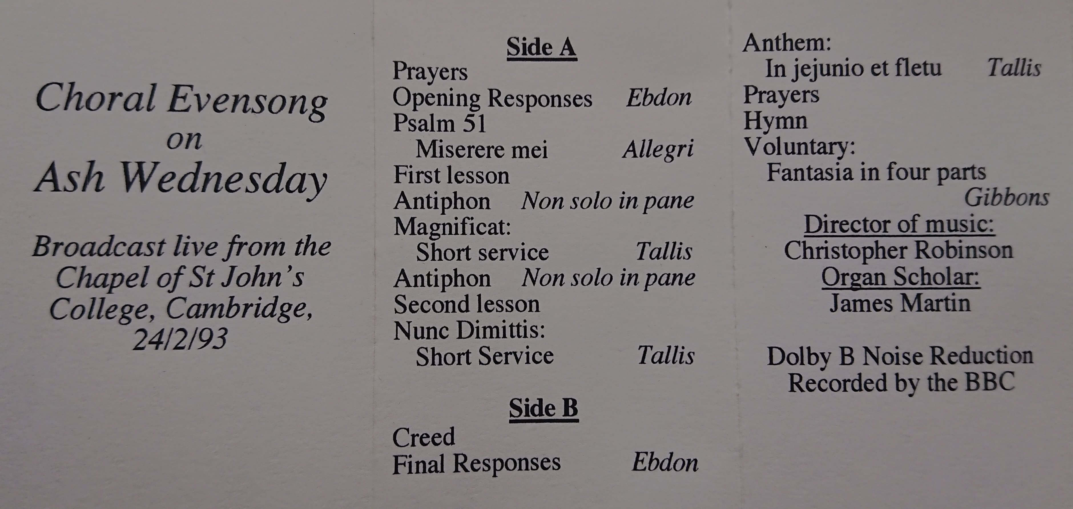 The Choir of St John's College, Cambridge - Evensong for Ash Wednesday 1993.opus